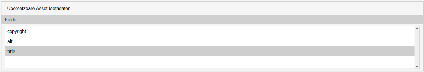 ![]() | Übersetzbare Asset Metadaten | Die Benutzerdefinierten Metadaten, die unter "Vordefinierte Asset Metadaten" definiert sind |