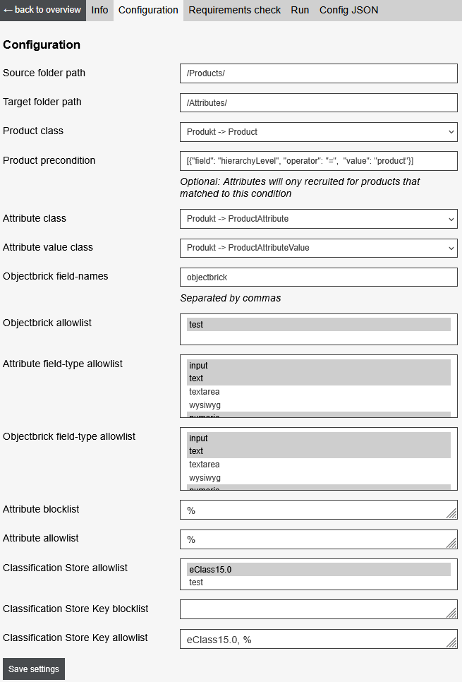 | Classification Store Key allowlist | Angabe einer Allow-Liste um bestimmte Klassifizierungsspeicher-Schlüssel aus der Block-Liste wieder in die Attribut-Rekrutierung einzuschließen. Wildcards möglich: * oder % benutzen für beliebige Zeichen.Mehrere Werte durch Komma trennen. |