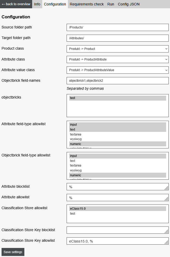 | Attribute field-type allow-list | Multi-select of Pimcore field types that are used |